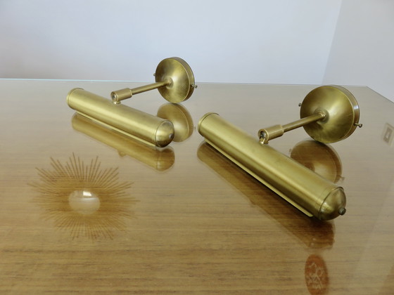 Coppia di applique con snodo sferico, Italia, anni '70-'80. In ottone. Larghezza 22 cm. Profondità 18 cm. Altezza 10 cm. Attacco E14 piccolo. Ideale per illuminare quadri. Ottime condizioni.