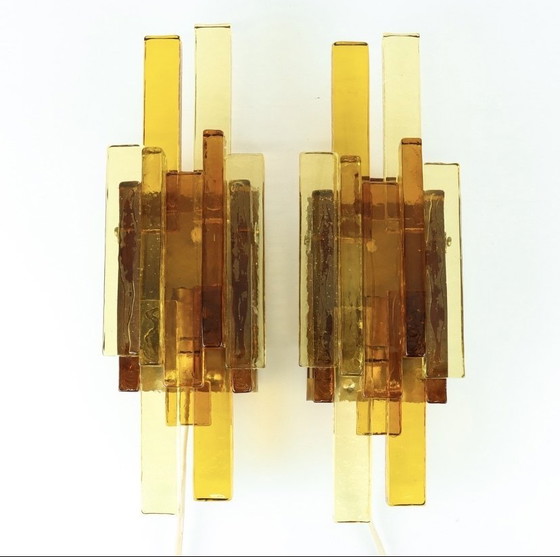 Applique Svend Aage Holm Sorensen realizzate con aste di vetro unite, supporto a parete in metallo, un punto luce ciascuna. Altezza circa 40 cm. Larghezza circa 13 cm. Etichetta presente, condizioni eccellenti.