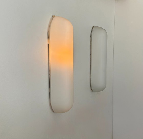 Coppia di applique oblunghe con struttura in metallo bianco opaco e diffusore opalino, prodotte in Francia negli anni Settanta.