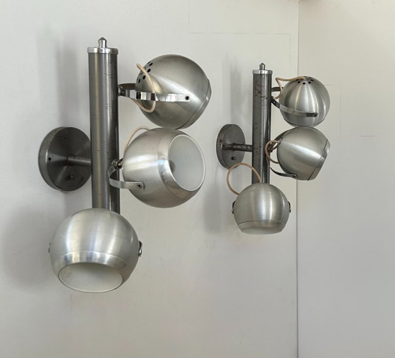 Coppia di applique con tre diffusori sferici orientabili, in metallo cromato e spazzolato, prodotte in Francia negli anni Settanta. Patina metallica.