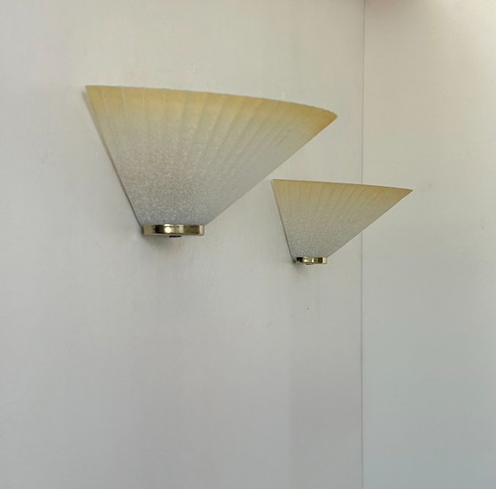 Coppia di applique a forma di conchiglia in vetro texturizzato montate su una base in ottone, prodotte in Francia negli anni '70.
