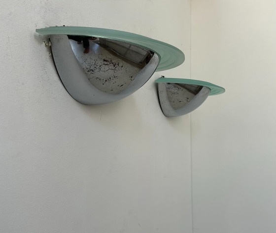 Coppia di applique in metallo cromato e vetro d'altaglia prodotte in Svezia alla fine degli anni '70.