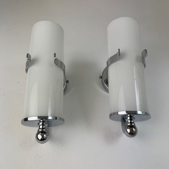 Splendida coppia di applique da parete in metallo cromato e opalino, "DELMAS", anni '70. Rimane un residuo dell'etichetta. Buone condizioni generali e forniscono una luce incantevole.