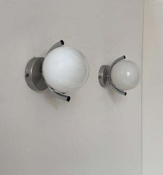 Coppia di applique composte da una struttura in metallo cromato e diffusori in vetro opalino, prodotte in Francia negli anni '70. Design curvo e senza tempo; luce calda e diffusa emanata dal vetro opalino.
