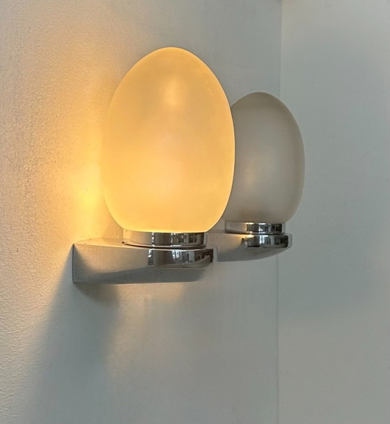 Coppia di applique, ciascuna con montatura in metallo cromato e diffusore ovale in vetro satinato, prodotte in Francia negli anni '70.
