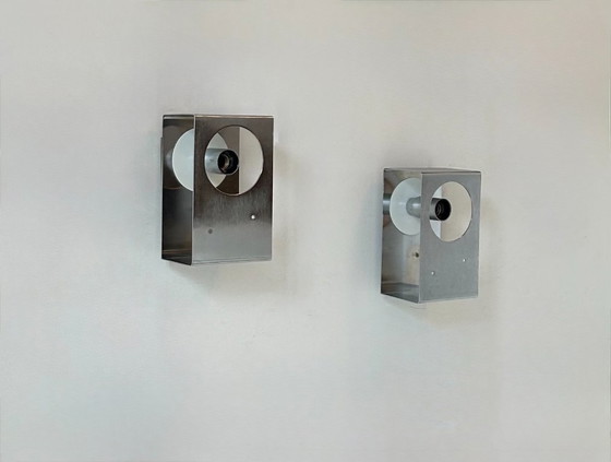 Coppia di applique in metallo spazzolato, prodotte in Francia negli anni '70. Design geometrico tipico degli anni '70.