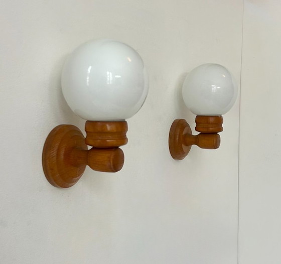 Coppia di applique con struttura in pino e diffusori in vetro opalino, prodotte in Francia negli anni '80.