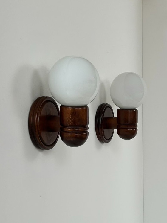 Coppia di applique vintage, pino e vetro opalino, Francia, 1980