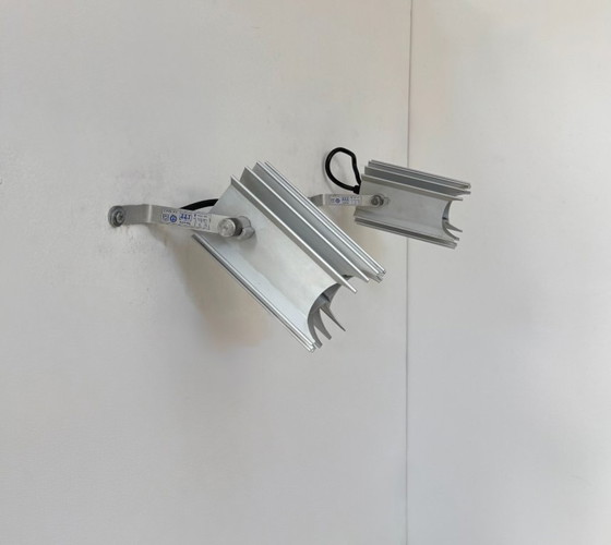 Coppia di applique orientabili in fusione di alluminio, prodotte in Italia negli anni '80. Design geometrico e originale. Illuminazione direzionale.