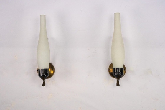 Elegante coppia di appliques italiane della metà del secolo scorso, attribuite allo stile Arredoluce, circa anni '50. Ciascuna applique presenta una struttura scultorea in ottone con dettagli curvilinei, che sostiene paralumi in vetro opalino allungato che diffondono la luce con un bagliore morbido e raffinato. L'interazione tra la patina calda dell'ottone e l'elegante vetro opalino crea un'estetica senza tempo, caratteristica del design modernista italiano. Completamente funzionante con cablaggio standard UE, facilmente adattabile agli standard USA su richiesta.