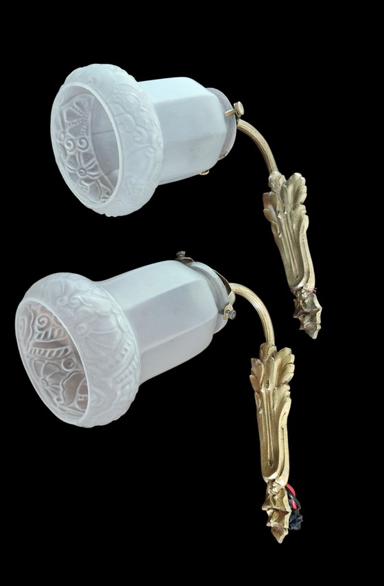 Coppia di appliques in bronzo dorato e vetro smerigliato sagomato - periodo Art Nouveau