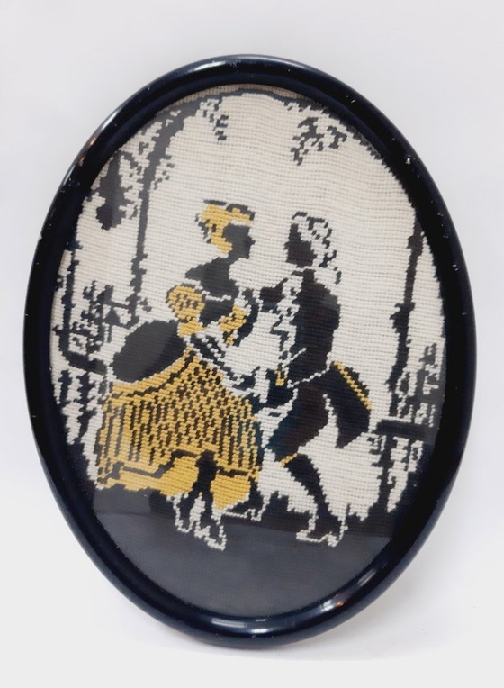 Coppia di ballerini ricamati con punto croce incorniciato d'epoca