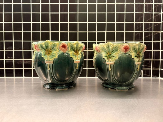 Coppia di cachepot in maiolica stile liberty, epoca 1900 circa