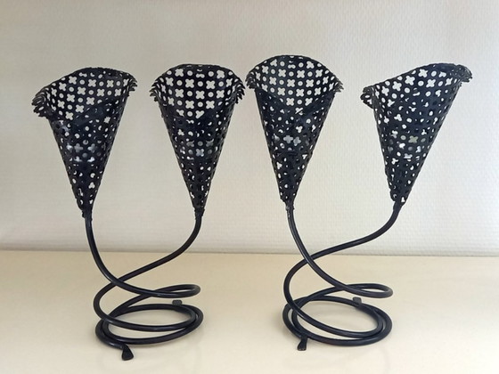 Una splendida coppia di candelabri doppi realizzati in lamiera traforata, che ricordano gli iconici design di Emmanuel Matégot.