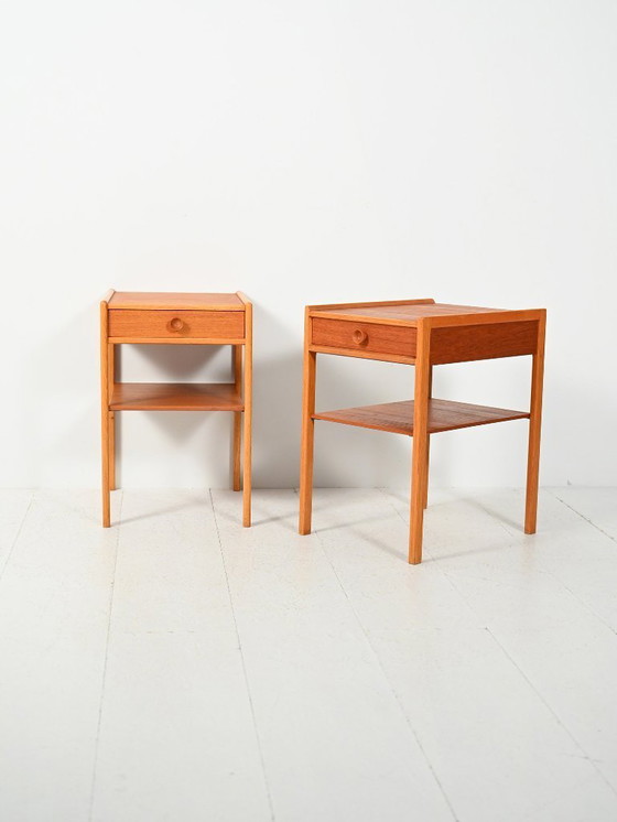 Realizzati in teak dalle venature intense, questi comodini scandinavi presentano una bordatura in rilievo che disegna una sottile linea d'ombra lungo il piano. Il cassetto si inserisce perfettamente nella struttura, mentre il portariviste inferiore ne mantiene la silhouette ariosa. Le delicate variazioni di tonalità del legno aggiungono profondità e un discreto senso di movimento.
