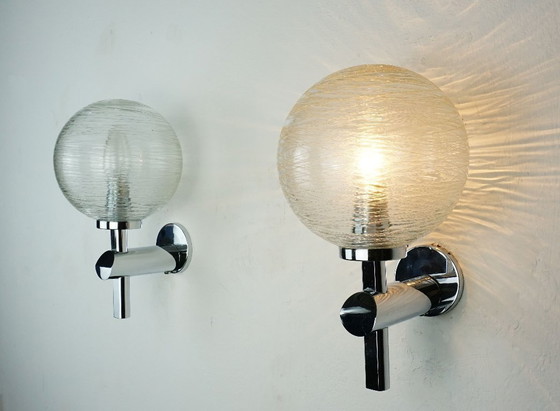 Una splendida ed elegante coppia di applique prodotte tra gli anni '70 e '80. La base è in metallo cromato con un leggero tocco Bauhaus nel design. I paralumi sono in vetro bianco con una superficie strutturata a righe. Per lampadine E14. Si consiglia l'installazione da parte di un professionista.