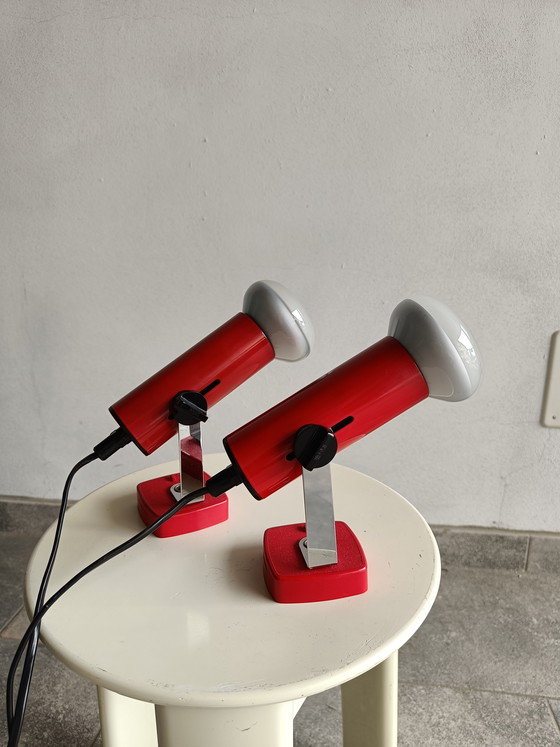 Targetti Sankey, design italiano, illuminazione anni '70, faretti vintage, applique regolabile, faretto da soffitto, lampada in metallo rosso, modernismo di metà secolo, design dell'era spaziale, modernismo italiano, coppia di lampade vintage, design industriale, illuminazione retrò, acciaio cromato, luce direzionale, illuminazione da collezione, icona del design, made in Italy, interni vintage, illuminazione di design, coppia di lampade