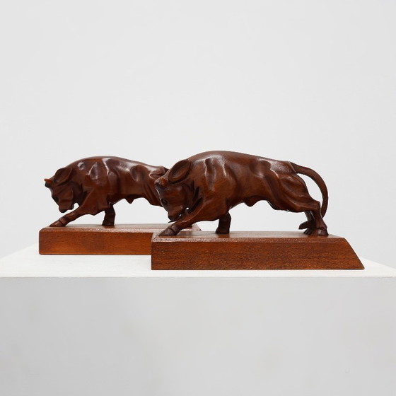 Coppia di fermalibri Art Déco in quercia a forma di toro, Francia, anni '30