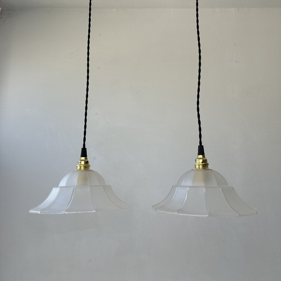 Set di due lampade a sospensione in vetro Art Déco. In buone condizioni generali. Nuovo cablaggio con filo intrecciato nero. Pronte per essere collegate con un domino. Attacco a vite in ottone (lampadina E14) e rosone di montaggio in metallo nero. Ideale sopra un piano di lavoro o un tavolo. Larghezza paralume: 20 cm Altezza paralume: 9 cm Diametro rosetta: 8 cm Filo: 1 m Peso: 1 Kg Lampada da tavolo, lampada snodabile, lampada da tavolo, lampada da scrivania, lampada da parete, lampada a sospensione, lampada da soffitto, vintage, garage, lampada portatile, opalina, vetro Clichy, lampada industriale, lampada a fisarmonica, lampada a zip-zag, collo di cigno, officina di fabbrica, industriale, lente di Fresnel, Arlus, Cremer, Kaiser Idell, Jumo, Gras Ravel Clamart, Jielde Holophane, Sanfil, Solere, Kandem, Mazda, Midgard, Perriand, Le Corbusier, Singer, Hala, Luxo, Bauhaus, Schaco, Super Chrome, lampade da parete, luci Art Déco, lampada da fabbrica, applique, lampada da scrivania, lampada a forbice da fabbrica.