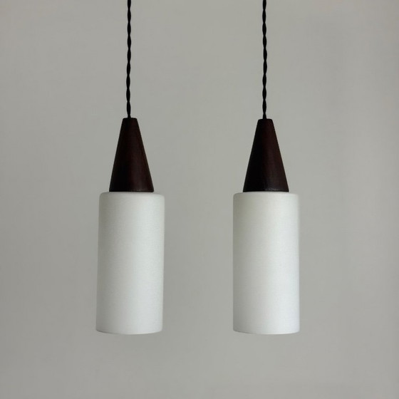 Set di 2 splendide lampade a sospensione scandinave in vetro opalino e teak. Risalenti al 1970 circa. In buone condizioni generali. Presentano alcuni segni del tempo.