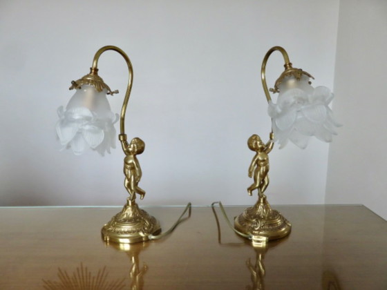Coppia di lampade "cherubini" in stile art nouveau. Sono in bronzo e i tulipani a forma di rosa sono in vetro smerigliato. Si tratta di una vera e propria coppia in quanto asimmetrica. Altezza 36 cm. Larghezza 11 cm. Profondità 19 cm. Peso della coppia 3,8 kg. Gli attacchi sono a vite E14 (forniti con lampadina). Condizioni eccellenti, con una micro-miss, appena visibile a occhio nudo, sul retro di un tulipano.