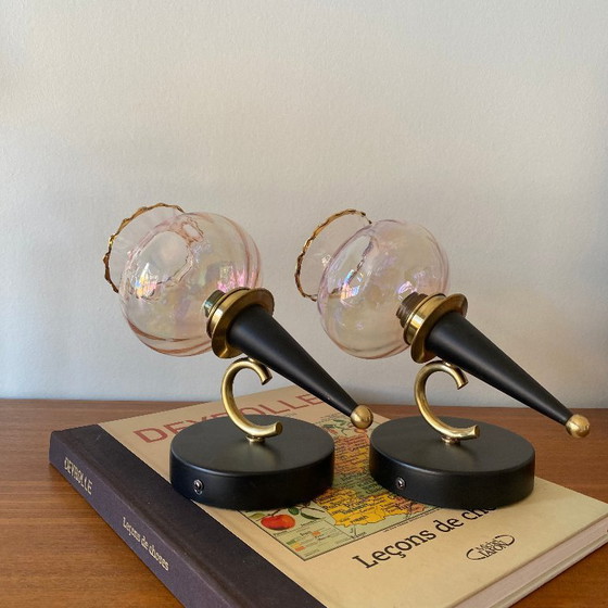 Coppia di lampade da parete a forma di torcia con paralumi in vetro rosa iridescente e finiture dorate