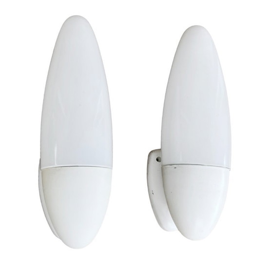 Coppia di lampade da parete tipo 13702 prodotte in Cecoslovacchia a metà del XX secolo per Elektrosvit Nové Zámky. Una lampada con paralume in vetro sbiancato montato su una base in bachelite. L'oggetto è in stile Bruxelles con elementi industriali. La lampada funziona con una singola lampadina E27 fino a 60W. Le lampade sono in buone condizioni, i paralumi sono intatti, mentre è visibile un leggero scolorimento sulle basi in bachelite. Bellissimi oggetti della metà del XX secolo, un classico dello stile della prima era spaziale. Prezzo per coppia.