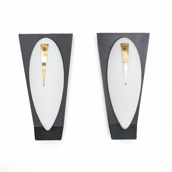 Coppia di lampade da parete di manifattura italiana prodotte negli anni '50. Struttura in metallo verniciato nero. Diffusore in vetro opalino bianco e ottone. Buone condizioni generali, piccoli segni d'uso. Dimensioni: Lunghezza 17 cm - Profondità 8 cm - Altezza 33 cm RIF L0763