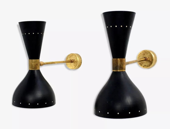 Coppia di applique italiane in ottone con paralume in metallo laccato nero.
