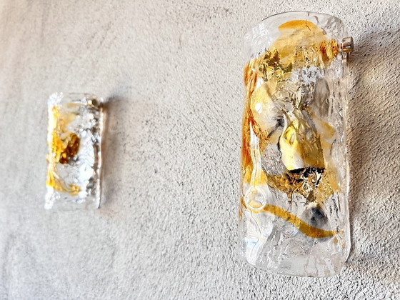 Splendide lampade da parete di design di metà secolo, prodotte negli anni '70 da Mazegga. Vetro di Murano curvo con venature arancioni, montate su un portalampada cromato. In ottime condizioni vintage.