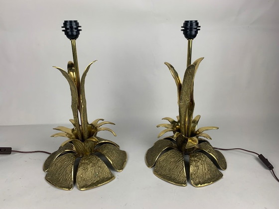 Questa coppia di lampade da tavolo francesi degli anni '70 presenta un design di grande effetto con un motivo floreale. Realizzate in bronzo, queste lampade presentano una finitura strutturata e lucida che aggiunge eleganza e raffinatezza a qualsiasi ambiente. Il colore oro esalta il loro fascino vintage, rendendole un'aggiunta perfetta a un arredamento retrò o classico. Queste lampade non sono solo funzionali, ma fungono anche da pezzi decorativi, riflettendo l'estetica del design degli anni Settanta.
