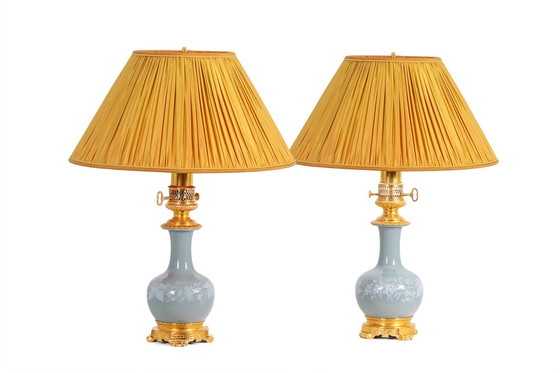 Coppia di lampade in porcellana celadon e bronzo dorato. Circa 1880.