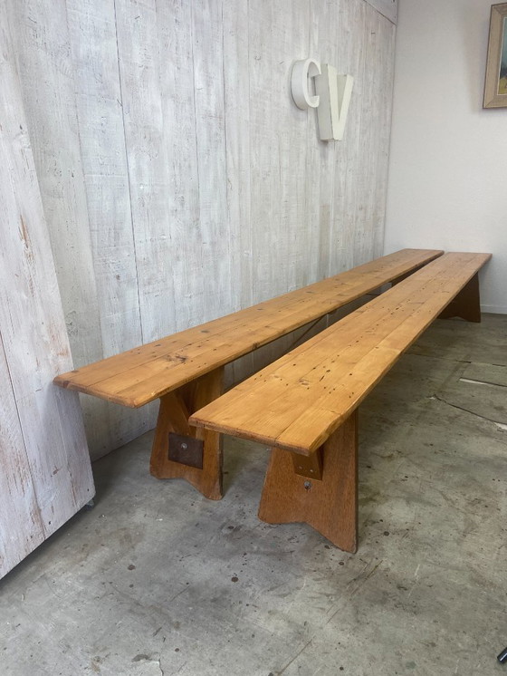 Coppia di grandi panche antiche (330 cm) trovate nel fienile di una piccola fattoria nel Massiccio del Giura. Le abbiamo pulite e disinfettate per un utilizzo ottimale. Amiamo il mix di materiali (legno e metallo) e le linee pulite e rustiche. I vari segni del tempo ne testimoniano l'autenticità.