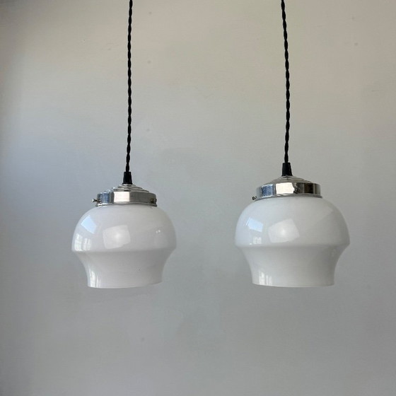 Set di 2 bellissime piccole luci a sospensione opaline vintage. Bella luce. In buone condizioni.