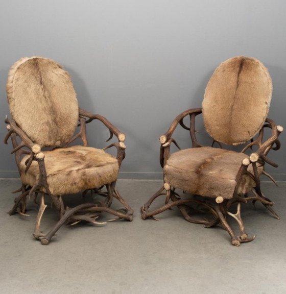 Coppia di sedie uniche in corna di cervo, XIX/XX secolo, origine Austria o Germania