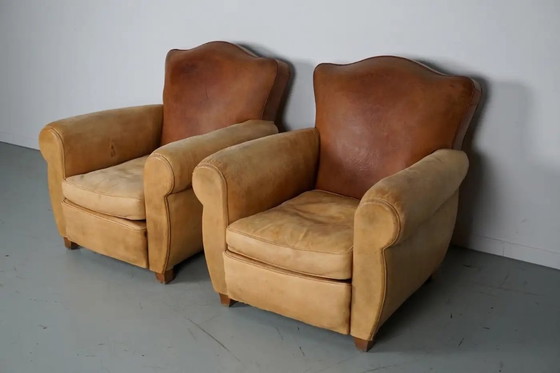 Coppia di poltrone da club francesi in pelle color cognac con schienali a baffo, anni '40