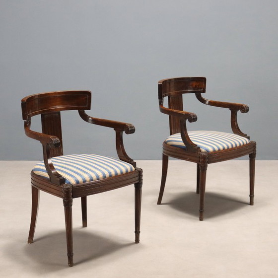 Coppia di poltroncine in noce. Schienale a giorno avvolgente con braccioli culminanti a ricciolo, e intagli fogliacei, gambe anteriori tornite e rastremate, seduta imbottita amovibile. Piccole mancanze. Italia, fine XIX Secolo.