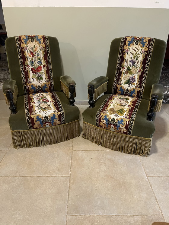 Coppia di poltrone antiche in legno, rivestite in velluto verde scuro con arazzo centrale, frange floreali sui braccioli e sulla parte inferiore, struttura solida, sedute in ottime condizioni.