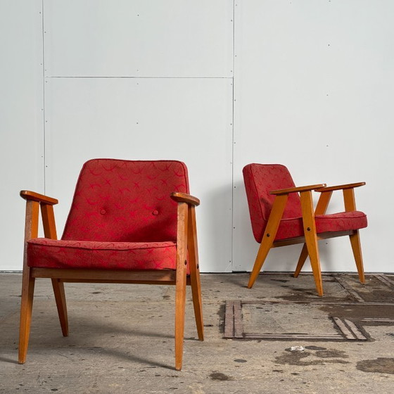 Coppia originale di poltrone Tipo 366 disegnate da Józef Chierowski negli anni '60. Strutturalmente solide e ancora utilizzabili, ma siate realistici: la spugna si è indurita nel tempo e si consiglia di sostituirla se si desidera un comfort adeguato. Un'ottima base per un leggero restauro, con tutti i segni di usura visibili nelle foto.