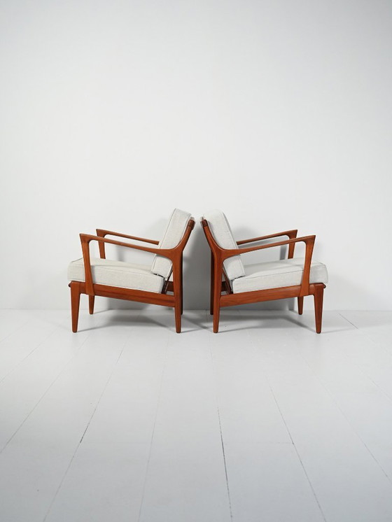 Linee eleganti ed equilibrate, con braccioli affusolati e ampio schienale a doghe, caratterizzano l'iconico modello "Kuba" di Bertil Fridhagen per Bröderna Anderssons Ekenässjön. Struttura in teak dai toni caldi con seduta ampia e confortevole. Cuscini sfoderabili di nuova produzione in tessuto grigio ghiaccio. Entrambe le poltrone conservano le etichette originali del produttore.
