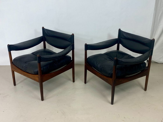 Coppia di poltrone Modus in pelle nera e palissandro, disegnate da Kristian Vedel per Søren Willadsen Møbelfabrik.