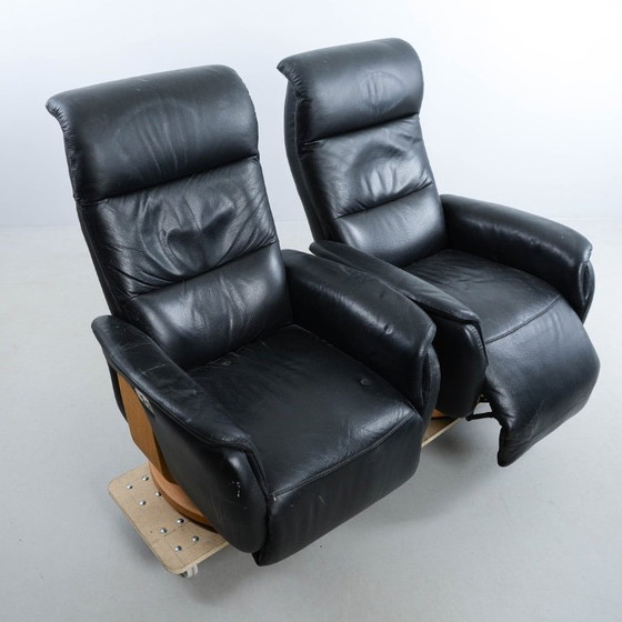 - Dotate di una robusta base in legno, queste poltrone reclinabili offrono stabilità e un tocco di calore naturale alla loro elegante finitura in pelle nera.
