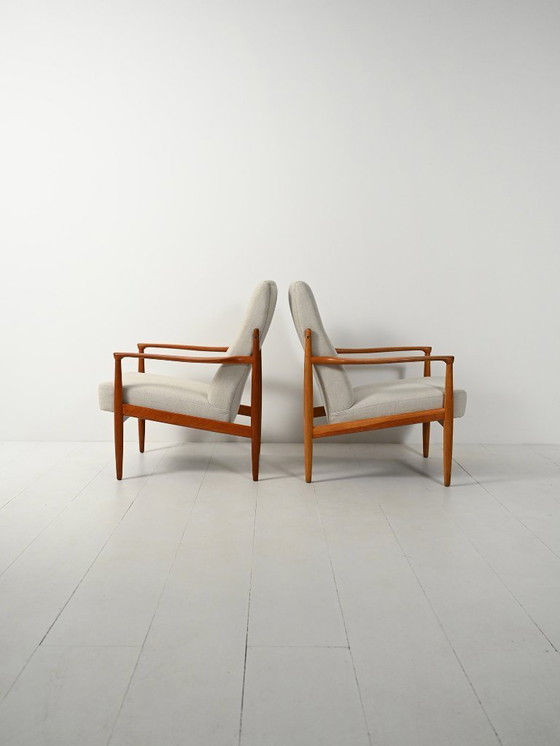 Coppia di poltrone scandinave degli anni '50-'60 in teak con venature calde e uniformi. I braccioli scorrono in una morbida linea continua che si unisce allo schienale; gambe snelle e delicatamente divaricate con traverse discrete. La nuova imbottitura e il rivestimento in tessuto grigio ghiaccio sottolineano la sobria eleganza del modello.
