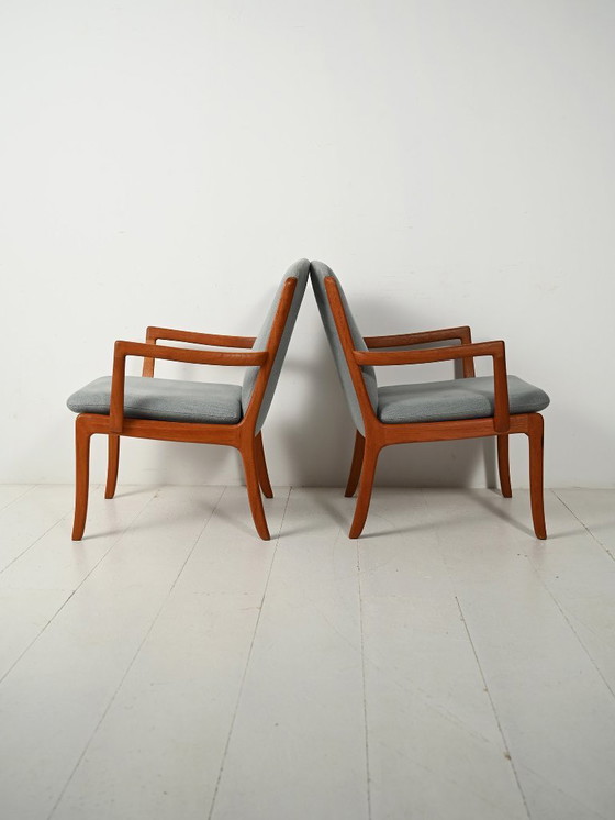 Coppia di poltrone danesi Senator di Ole Wanscher per Cado, in teak massello con tessuto grigio-blu.