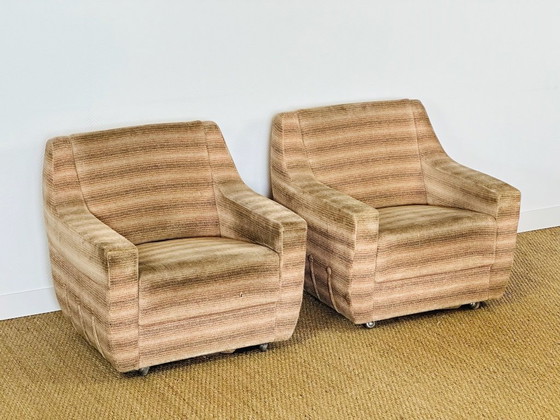 Le poltrone sono rivestite nell'originale tessuto a righe orizzontali nei toni del beige e del marrone, che conferisce una bella texture e un autentico fascino retrò.