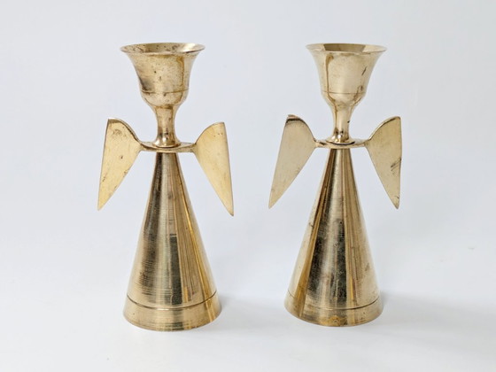 Splendida coppia di portacandele in ottone in stile Mid-Century Modern, ognuno dei quali raffigura un angelo stilizzato con un elegante stelo conico e ali scultoree su entrambi i lati.