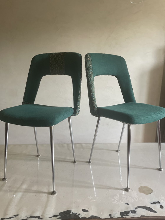 Vi presentiamo una coppia di sedie da conferenza vintage che fondono perfettamente eleganza e funzionalità. Queste sedie, rivestite in un ricco tessuto verde, emanano un fascino senza tempo che saprà valorizzare qualsiasi ambiente professionale. Le eleganti gambe in metallo aggiungono un tocco di modernità, fornendo una base solida per un uso prolungato.
