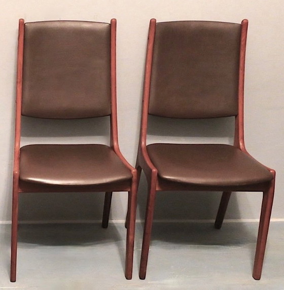 Coppia di eleganti sedie da pranzo in teak massello e pelle marrone, risalenti agli anni '60, con il marchio 'KS' per Korup Stolefabrik, Danimarca.