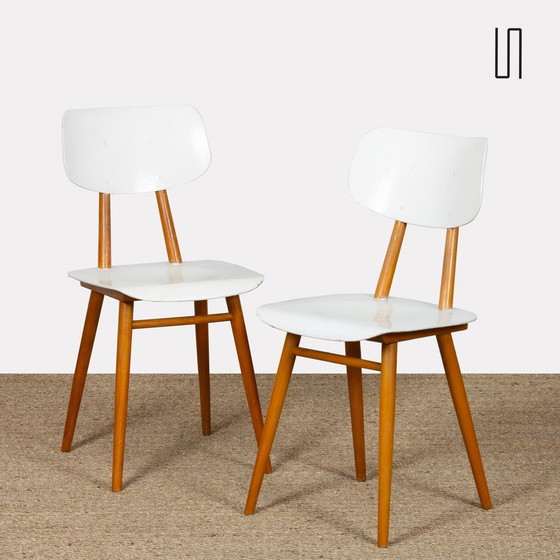 Questa coppia di sedie in legno è stata prodotta da Ton intorno al 1960 nella Repubblica Ceca. La seduta e lo schienale sono verniciati. Il set è in condizioni vintage. D1208