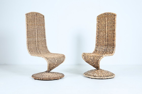 Bellissimo set di 2 sedie scultoree in foglia di banano su struttura in acciaio, prodotto negli anni '80 in Italia.